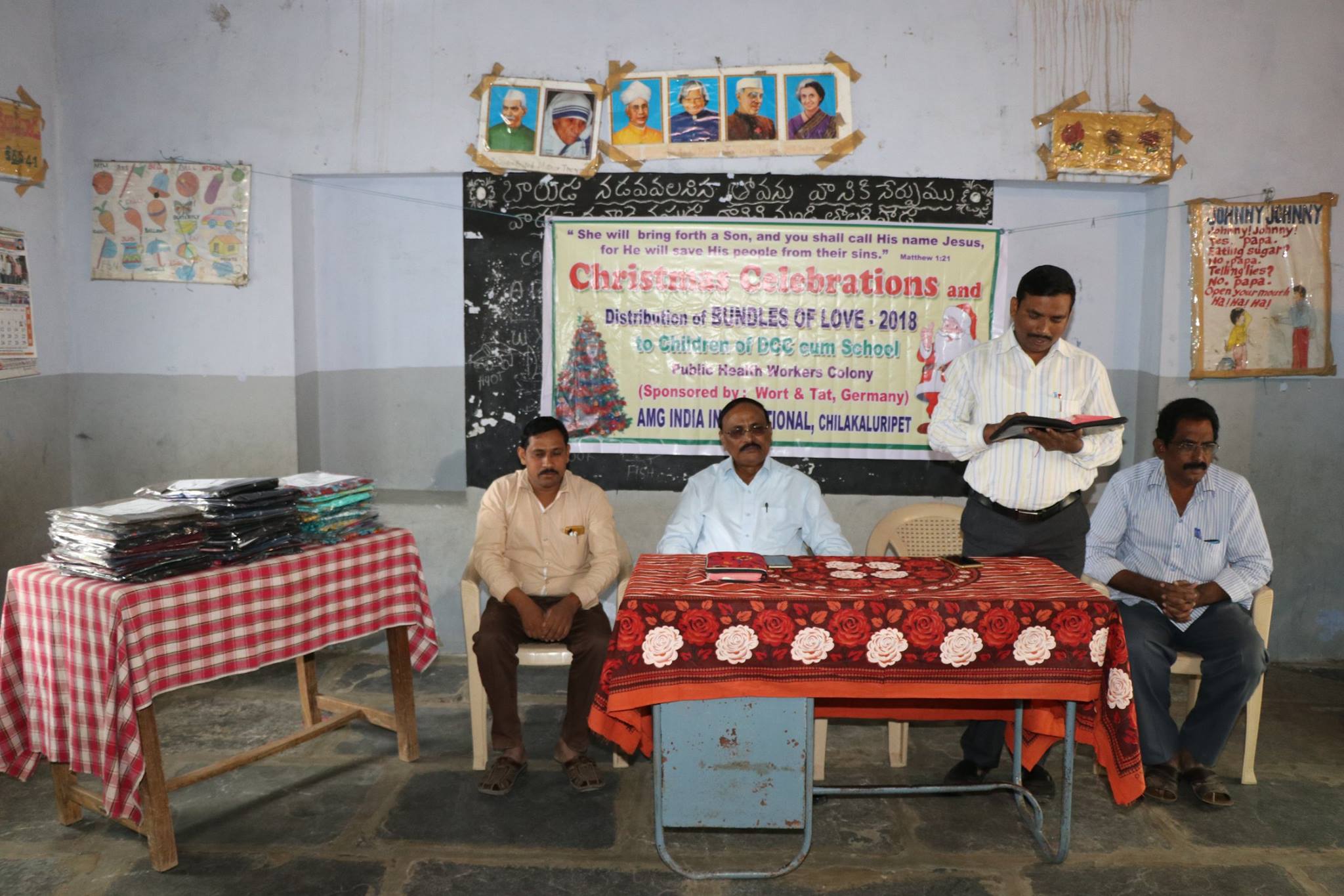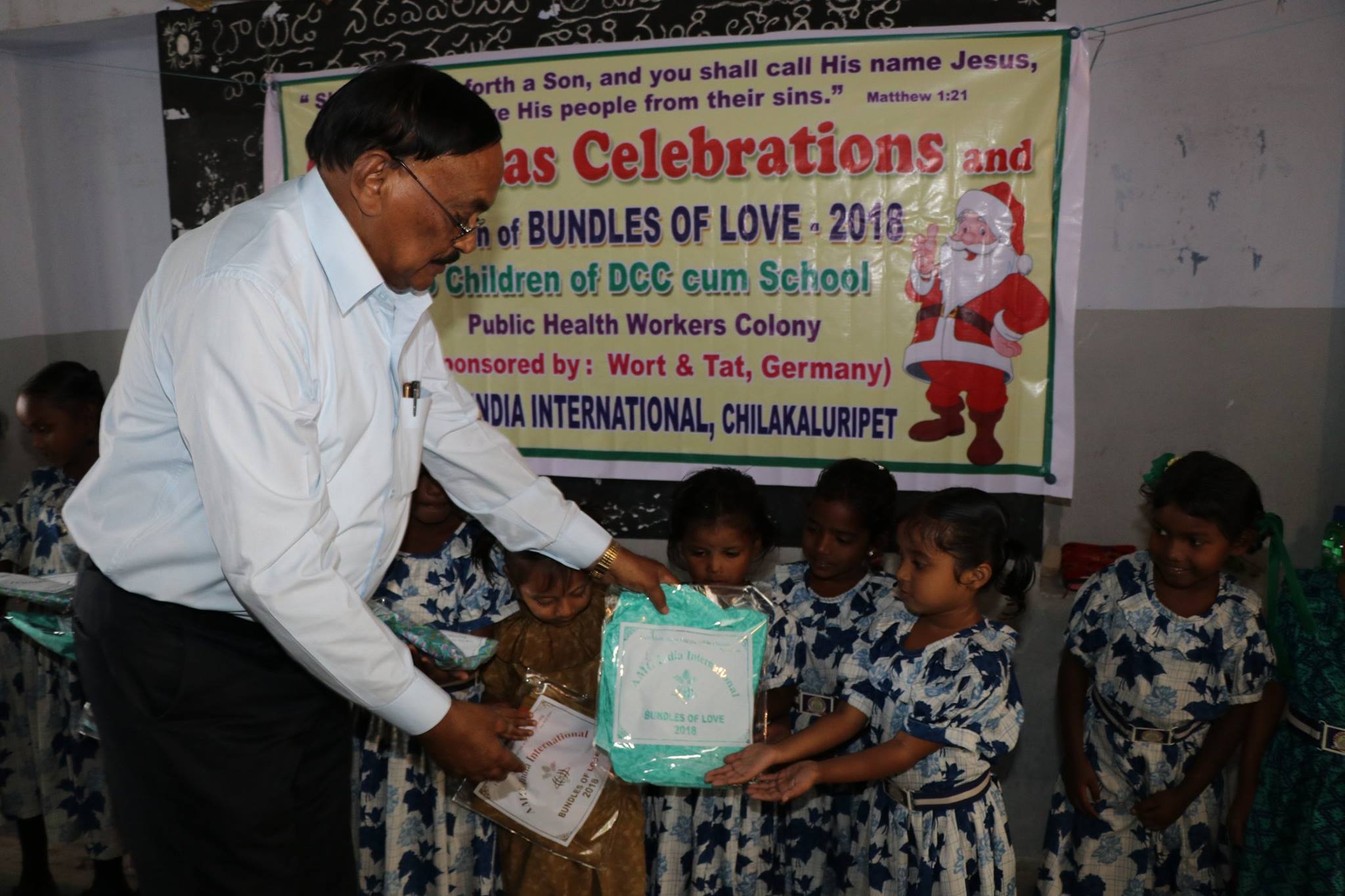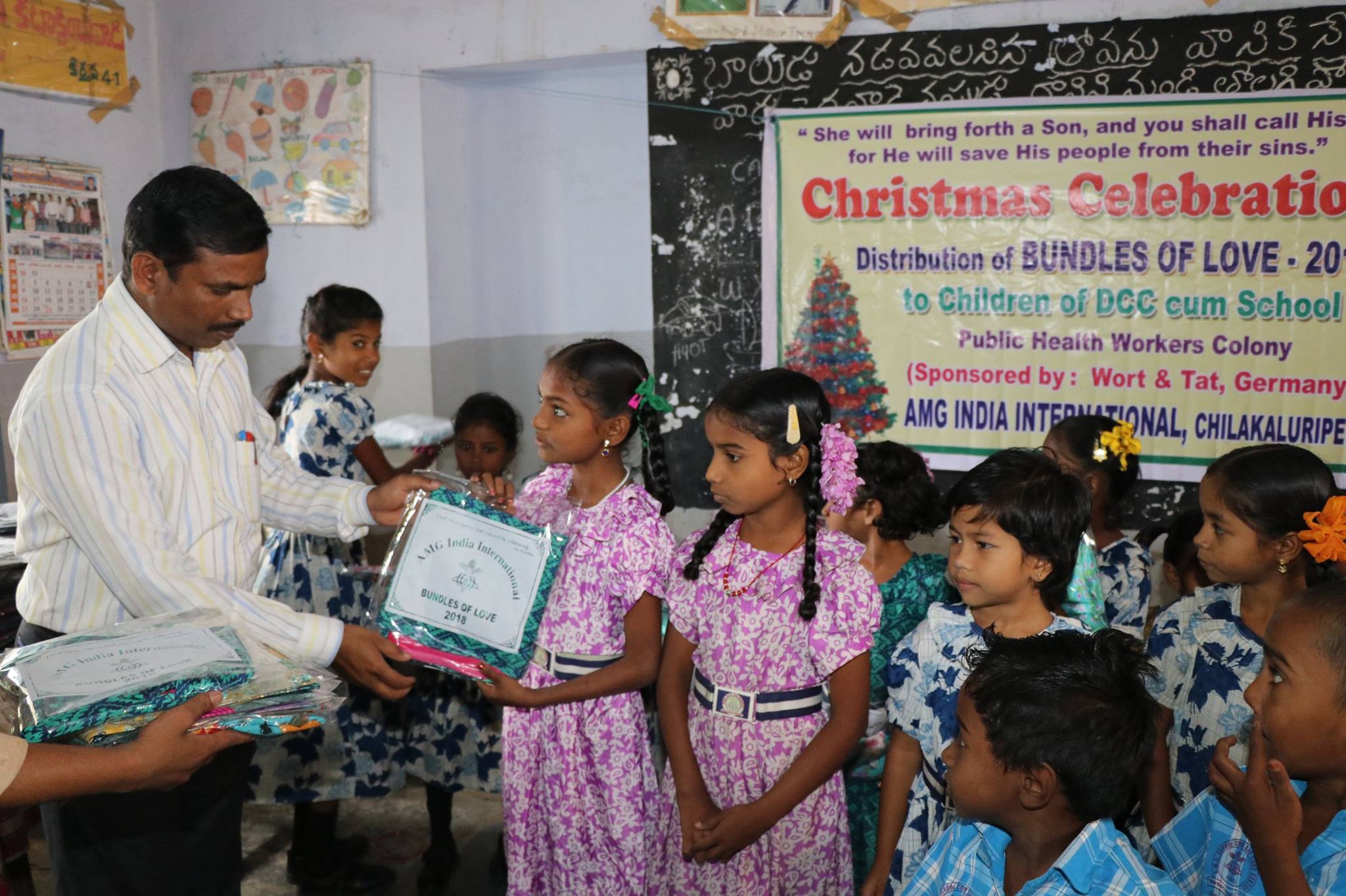 Christmas was celebrated with the children in AMG DCC School, for Public Health Workers children in Deichmann colony. Mr. B. Krupa Rao, CPO and Bro. Sudhakar Babu, Mr. M. Narayana Swamy participated and distributed New clothes to the children and wished them a Merry Christmas to the children and their families.