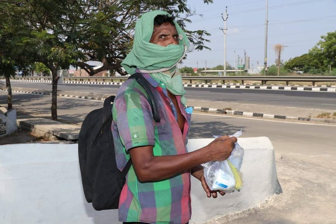 These migrant workers from different places are on their long walk to their villages, in different districts. As there is no work/ no money/ no buses etc, and haunted by the fear of Coronavirus, they have started on a long walk to go to their homes and are walking hundreds of kilo meters. They have no money to buy food and there are no hotels to buy food. AMG gave them food and water packets. They are very grateful to AMG and Donors for their timely help.