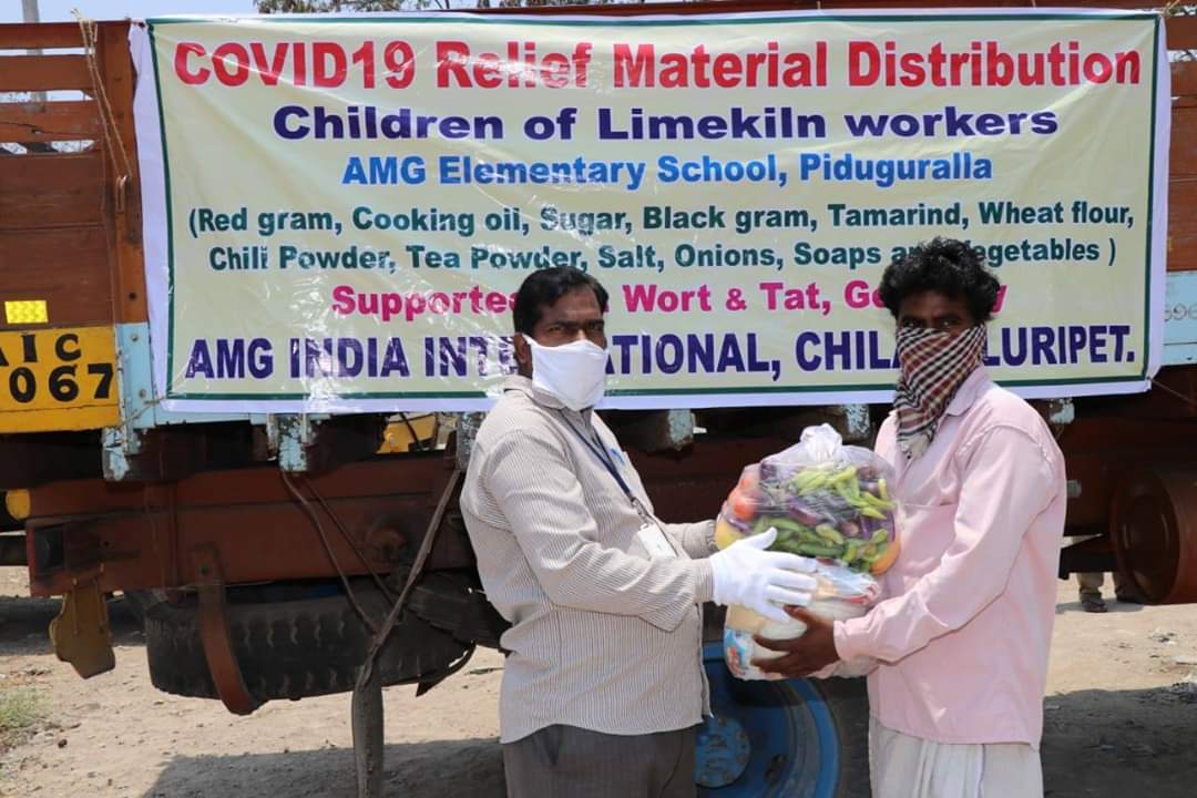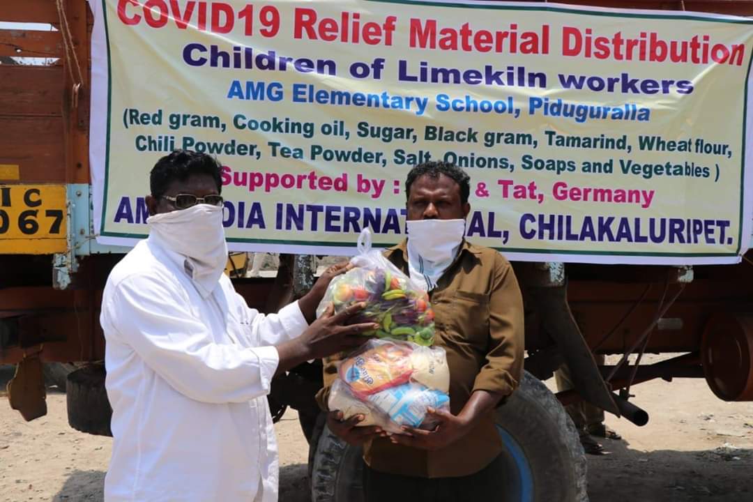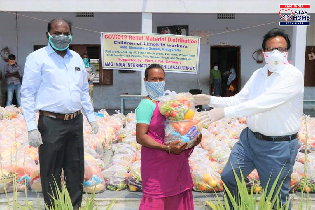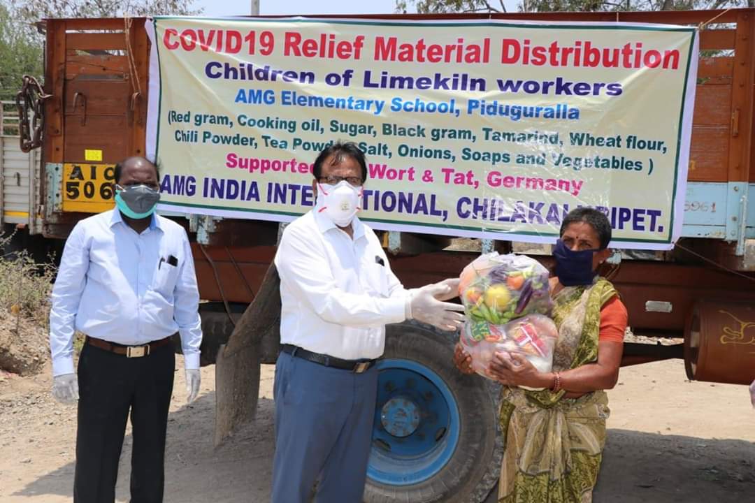 AMG School, Piduguralla, was started to educate the children of poor Lime kiln workers. They are very poor and came here from different districts of AP, to work in the kilns. The place is full of smoke and dust coming from the lime kilns. Due to lockdown the lime kilns were closed, and the workers did not have any work or income. Considering their utter poverty, our Donors, Wort & Tat, Germany came forward to provide rations to 650 poor lime kiln worker families.